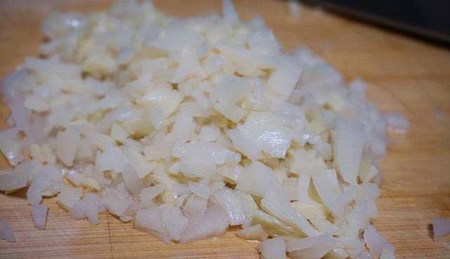 步驟2:筍片香菇切成小丁,中和油和肉的膩味,吃著也清新提味。幹香菇提前泡軟,那個筍片要先用熱水焯熟。