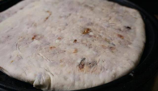 步驟8:搟完就是這個樣子,挺厚的所以電餅檔是最好不過的瞭,用小火去慢慢的煎,也不至於糊鍋,平底鍋不好翻面就給它切開,再去煎。