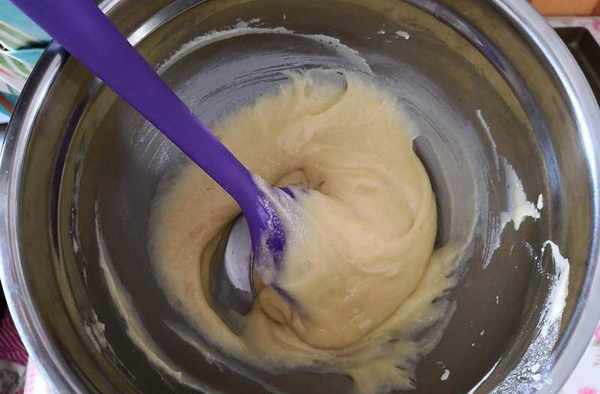 2. 再倒入食用油用刮刀攪拌均勻,很好拌的,不用手去揉哦,將拌好的面糊裝入裱花袋裡,剪一個小口,將面糊畫到不粘烤盤上,