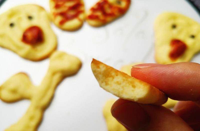 食材:香草餅幹粉200克,清水40克,雞蛋1個,玉米油40克,耐熱巧克力豆少許,番茄醬適量