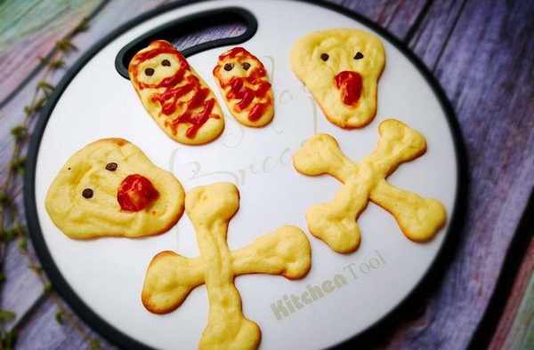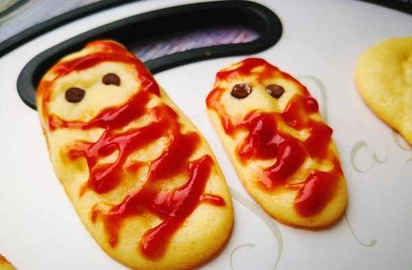 5. 為瞭好玩,我用番茄醬畫瞭可怕的嘴巴,還有木乃伊的樣子,如果用白巧克力或是沙拉醬會更像吧。