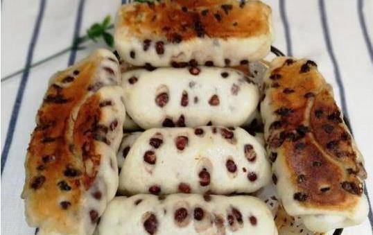 05、平底鍋刷好油,放進去少許清水,清水不能太多,剛剛墊一點紅豆卷的底部就好瞭。開火煮十分鐘就好瞭,盛出來的紅豆卷底部是焦黃的。