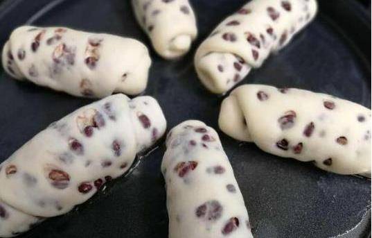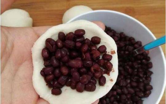 04、等到面團膨脹有彈性的時候就可以制作啦,把面團撕成一小團一小團的,用手按壓扁,有點包餃子的感覺。然後把備好的紅豆放在面團上面,拿搟面杖慢慢地按壓卷成卷。