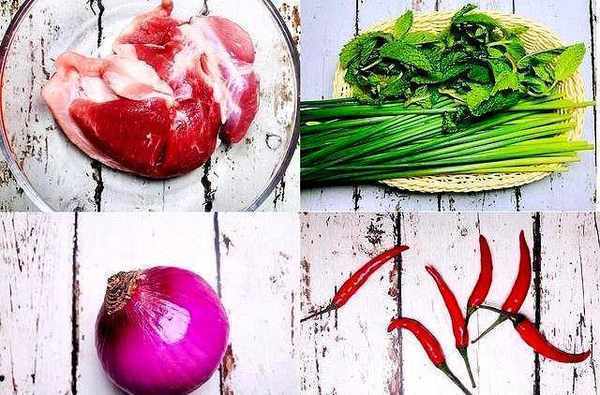 食材提前做準備:豬前腿肉切成大塊均勻塗抹上黑椒醬醃制半個小時入味,蒜苔芯洗凈切成段,小紅椒切塊薄荷擇葉備用,蒜拍碎洋蔥切片。