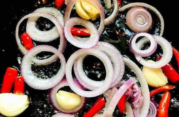 鍋中留底油加熱到5成放大蒜,洋蔥和紅椒塊炒出香味。