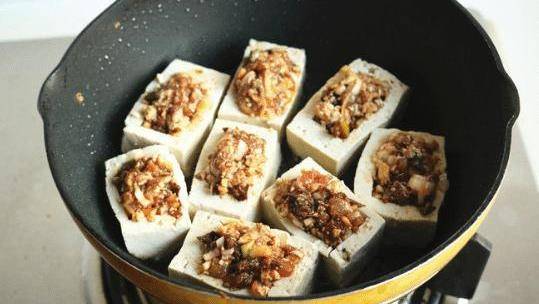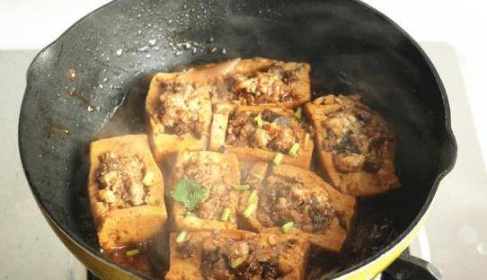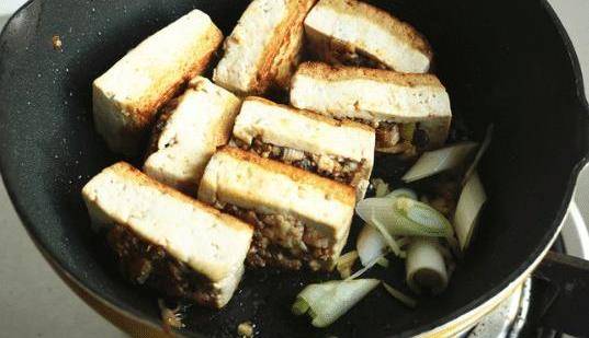 下一步正在醞釀。把準備好的肉餡放進豆腐裡。肉餡應該是滿的,而不是半個,否則煎的時候很容易掉出來。在平底鍋裡燒一點油,然後把肉餡放一邊煎,待肉餡凝固後再煎另一邊。豆腐變色後,先上桌,然後拌上醬汁,繼續燉至熟。
