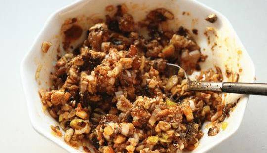 把肥瘦的豬肉切碎,然後切成泡沫。把前面挖出來的豆腐放進肉裡切碎。之後,我們準備青蔥、洋蔥、薑和大蒜,它們也要和肉一起切碎。當所有的配菜都切碎後,我們會把這些東西放進碗裡,然後加入醬油、生醬油、食用油和香精混合在一起。混合時間必須長,以便味道更好。