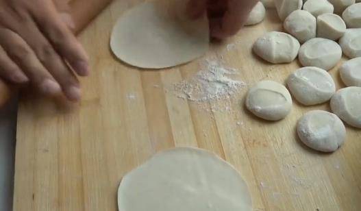然後把劑子搓圓,壓扁,用搟面杖搟成薄面皮。