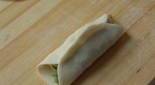 取面皮包上餡,將面皮從中間對折並捏合就可以瞭。