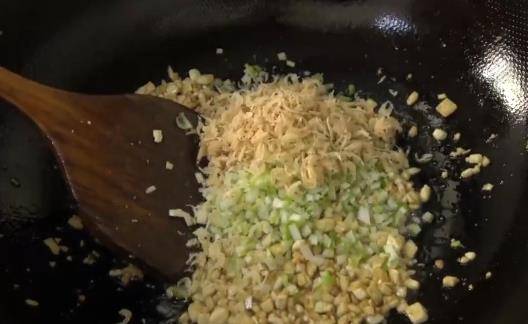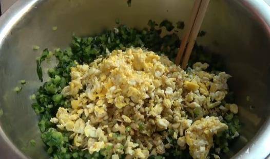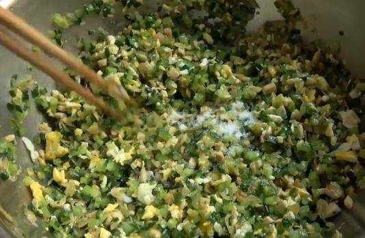 然後再加入蔥末,雞蛋末,再放一些蝦皮,調餡放瞭蝦皮以後,更夠味更香。炒勻炒香後關火放涼。