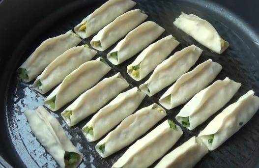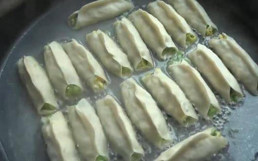 依次方法全部包好,包好後,鍋裡刷油,把做好的鍋貼坯放進鍋裡,用小火煎至底部微黃。