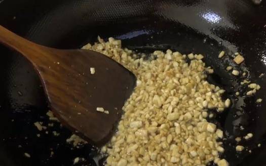 鍋裡倒油,燒熱,把切好的豆腐丁倒入鍋裡炒一下,炒至豆腐丁發黃。
