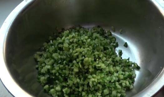利用醒面的時間,來準備餡料。先把3根黃瓜清洗幹凈,切成丁,裝進幹凈的盆裡,然後撒上一勺鹽,醃制10分鐘,把水分醃出來。