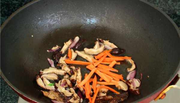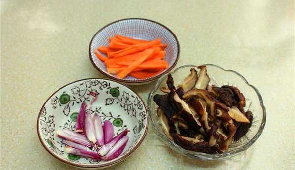 幹冬菇泡軟後切絲,蔥頭、胡蘿卜分別切絲