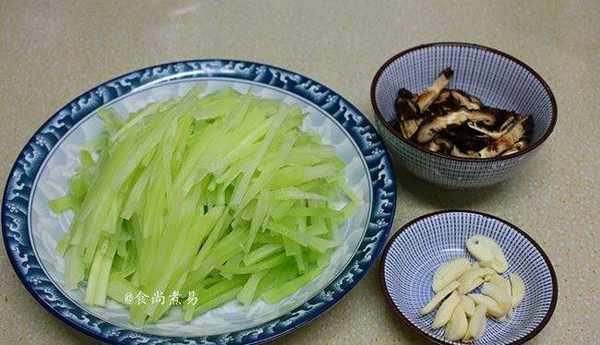 萵筍去皮洗凈,切絲、幹冬菇浸泡軟,洗凈切絲,蒜瓣去皮切片