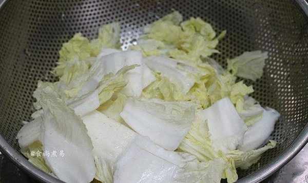 大白菜整片掰開,將菜梗對半撕開、浸泡洗凈,撈起瀝幹水