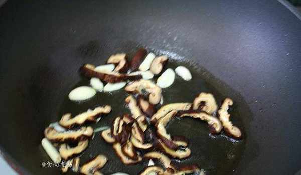 熱鍋倒入橄欖油,將蒜片和冬菇絲煸出香味