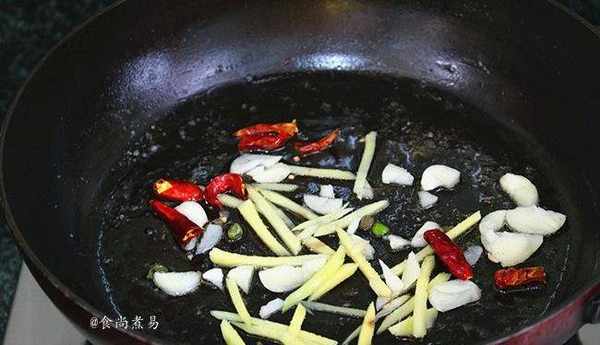 熱鍋倒油,倒入蒜、薑、辣椒、煸出香味