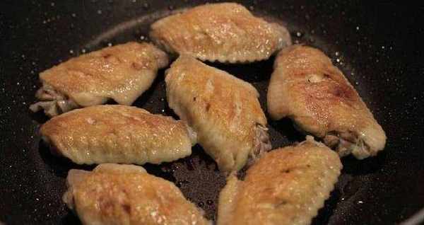 3、把雞翅放到鍋中,不用放油,用小火將雞翅煎到兩面金黃