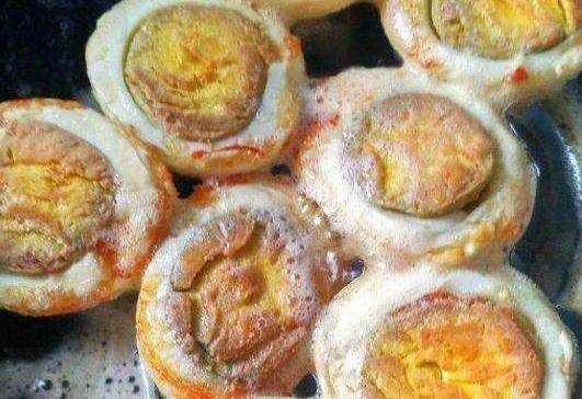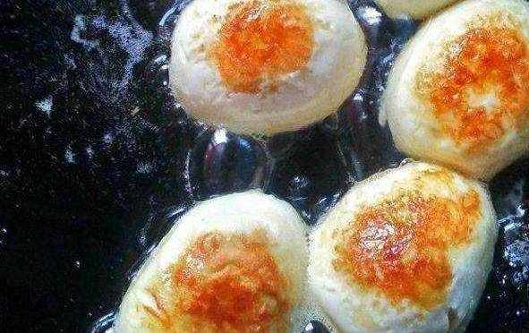 把煮熟的雞蛋從中間一切兩半,然後鍋裡倒油燒熱,直接放到鍋裡煎制,但要註意火小一點。