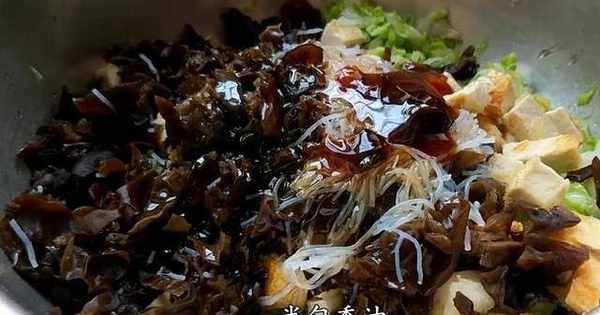 豆腐切成小丁,切點粉絲切點木耳,芝麻。這是殺好水的白菜,我們把水分給它擠掉,將白菜切碎,木耳跟粉絲加入蠔油兩勺油拌上香油,不需要放鹽攪勻。做成大小均勻的面劑,取一個皮兒包好,上鍋蒸8分鐘,好濃鬱的豆腐味。