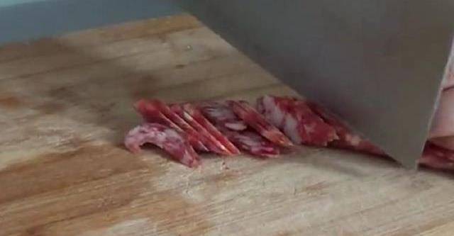 2.將臘腸切薄片,蒜子切片,放一旁備用。