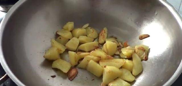 4.鍋中放一點油,下入蒜子炒香,再下入土豆塊煸炒至四周微焦。