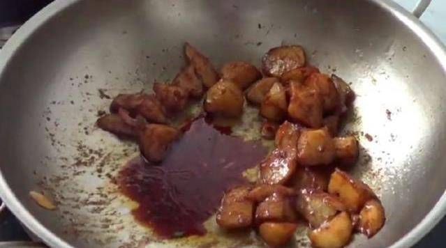 5.下入自己喜歡的醬,可以是豆瓣醬或者老幹媽醬翻炒均勻,然後下入生抽和少量老抽炒至上色。