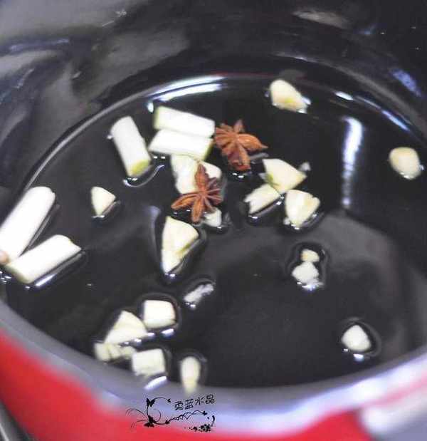 2.鍋裡倒入油,放入蔥、薑、蒜、八角炸香。