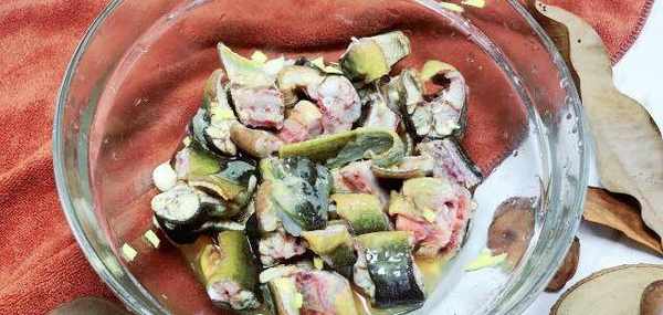 先把黃鱔魚摔死,用食鹽抓洗掉表皮的黏液,再用刀切不斷開的小塊;接著用開水燙一會,撈出再用涼水洗凈外層的黏液。