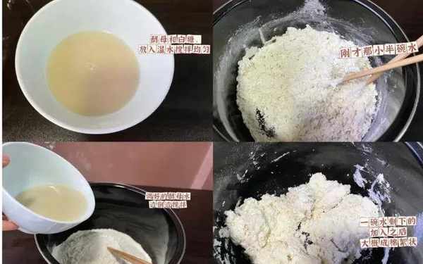 2.調好的酵母水,倒入面粉盆裡,邊倒邊攪拌,(慢一點,一定不要把酵母水一次性倒入。)