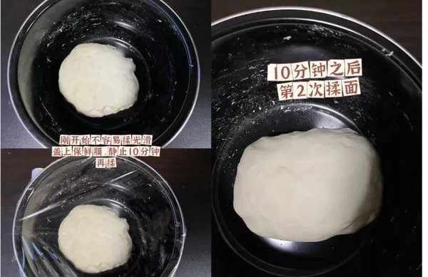4.用手揉成光滑的面團,剛開始不易揉光滑,可以揉一會,放在盆中蓋上保鮮膜,靜置10分鐘,再揉,一般揉好後,就是面光,手光,盆光。就是面粉揉完,手上,盆上都沒有面粉。