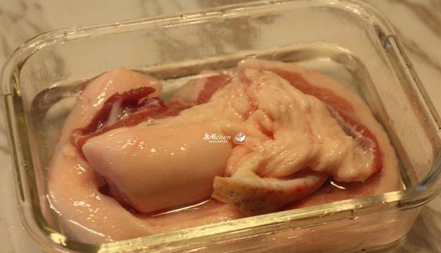 3把白酒和水倒入五花肉中醃制
