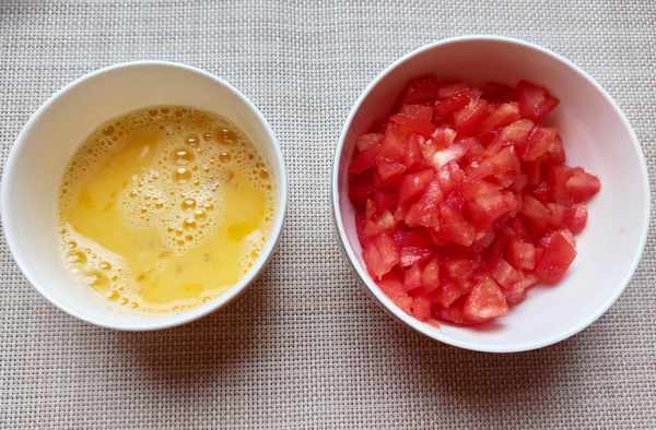 取出準備好的番茄,切十字刀,放入碗中,在番茄上面倒熱水,持續幾秒鐘,目的是為瞭把番茄燙軟,去掉外皮,去掉底部根蒂,改刀切成碎丁,再準備兩個雞蛋,充分攪拌一下。