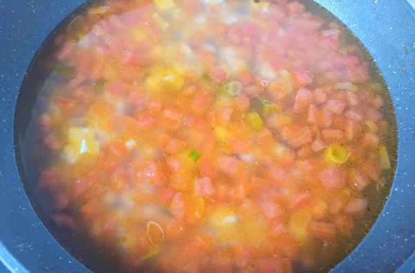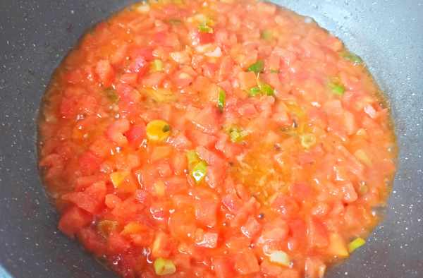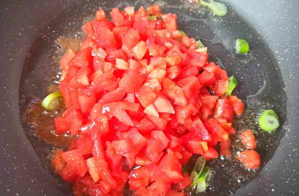 鍋內燒熱油,先下入切好的番茄,炒出番茄汁。
