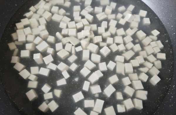 鍋內燒水,先加入1勺食用鹽,水開以後再下入豆腐塊,這樣做的目的,是為瞭去除豆腥味,持續1分鐘左右,撈出控幹。