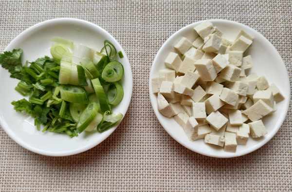 北豆腐切成四方塊,這裡需要註意一下,換成嫩豆腐也可以,並無具體要求,小蔥切成蔥花,香菜切成1裡面的段。