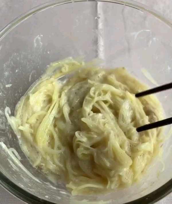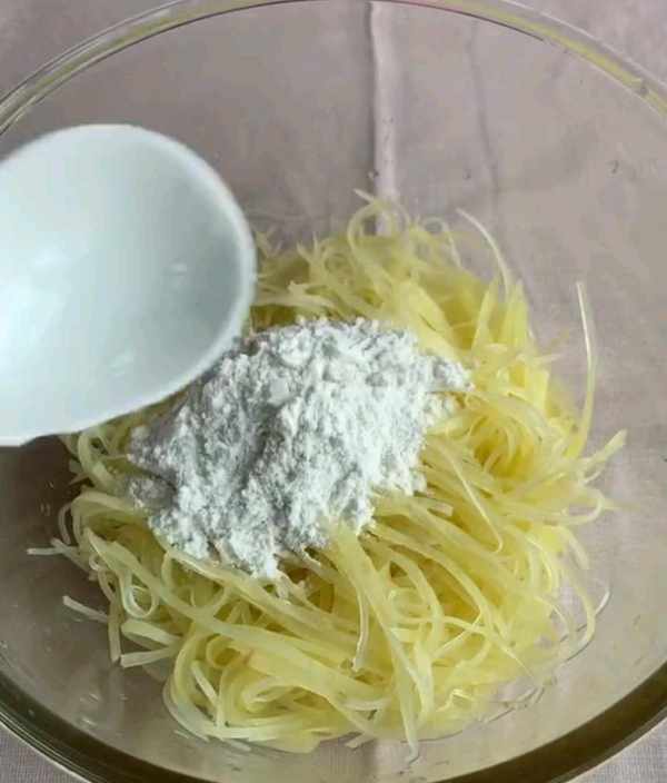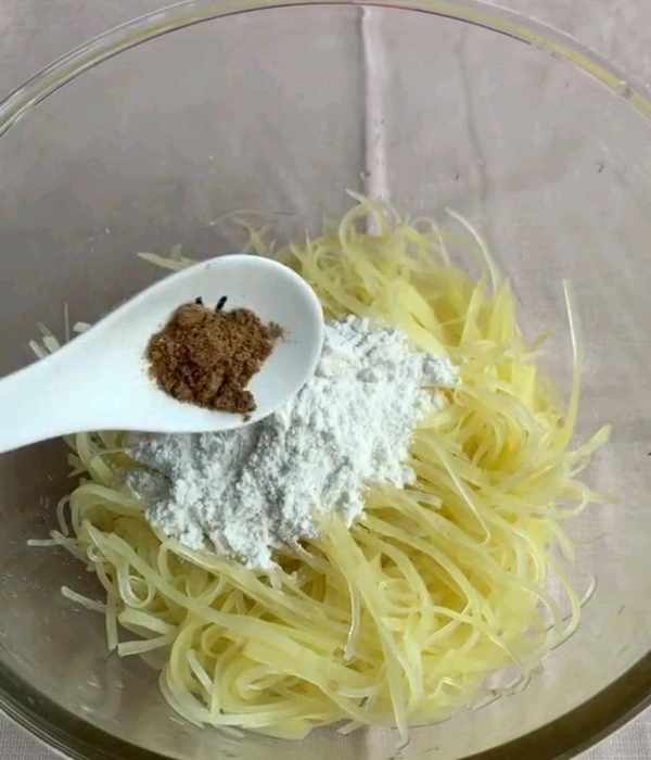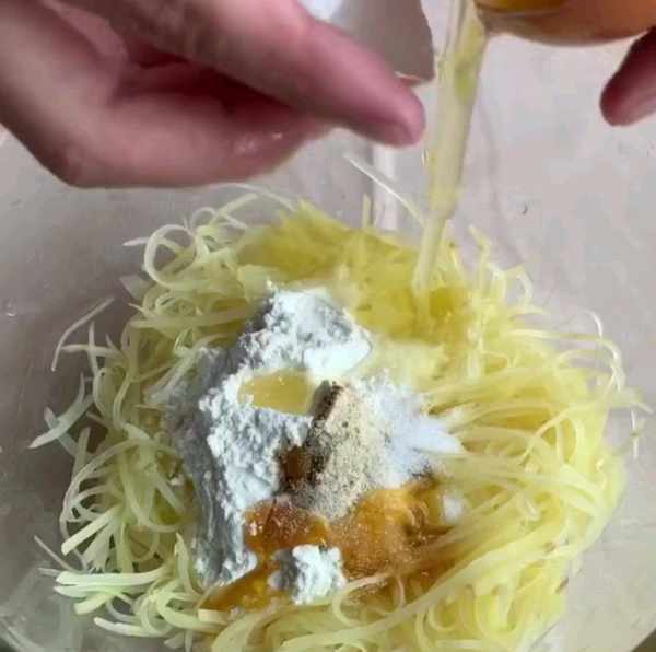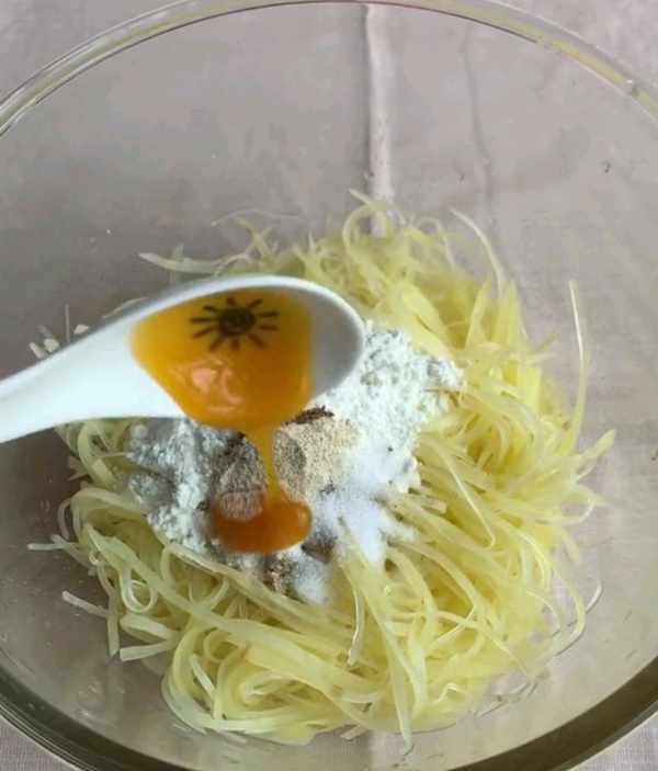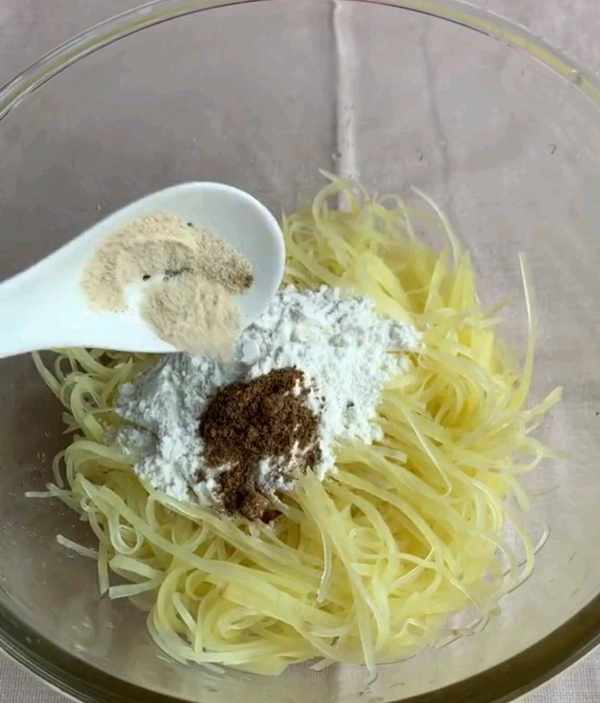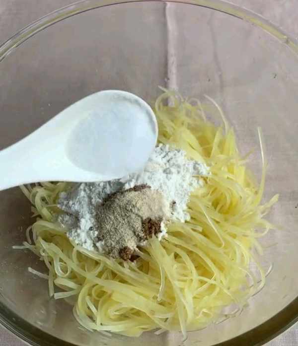 三、將控幹水分的土豆絲倒入碗中十三香、白胡椒粉、鹽、雞汁雞蛋清。