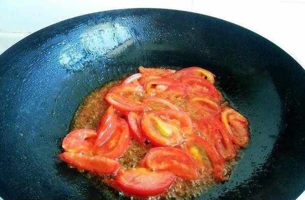 3.熱鍋倒油,油燒熱至8成下西紅柿,大火翻炒出香味和湯汁。