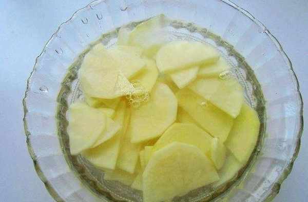 1.把土豆去皮切片,在涼水侵泡2分鐘,撈起瀝幹水分。