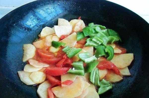 4,加土豆翻炒勻稱後,再加辣椒翻炒2分鐘樣子,炒出香味。