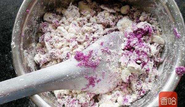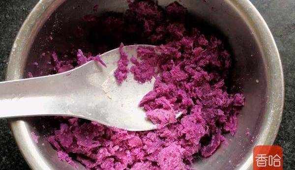 3.蒸好的紫薯用勺子搞成泥