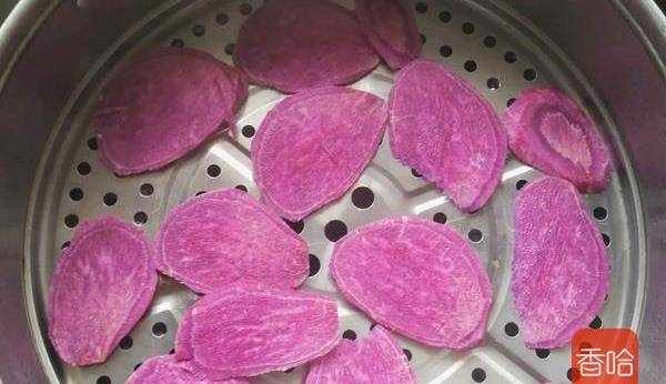 2.蒸鍋倒入水燒開,紫薯去皮洗幹凈切片放入蒸鍋蒸軟