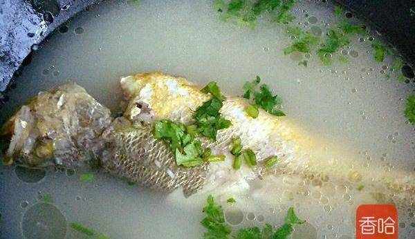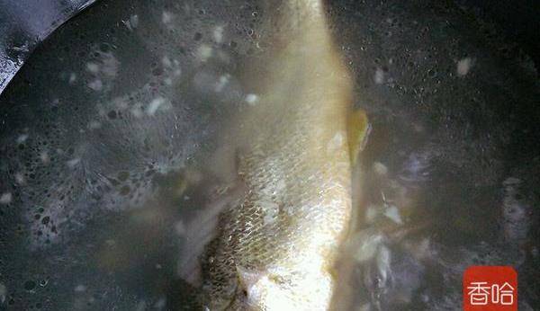 5.放入黃花魚,再次沸騰後轉小火,燉至湯汁變成乳白色。(平底鍋不好燉湯,我將它換成瞭炒鍋)