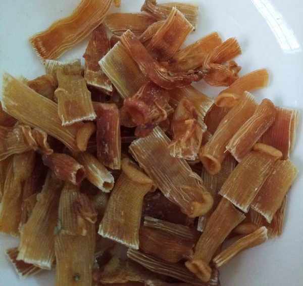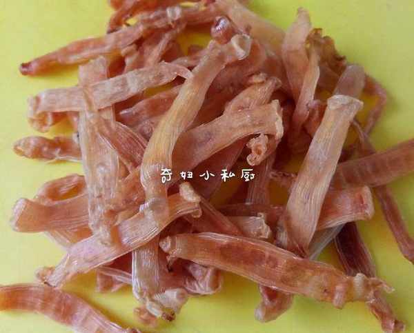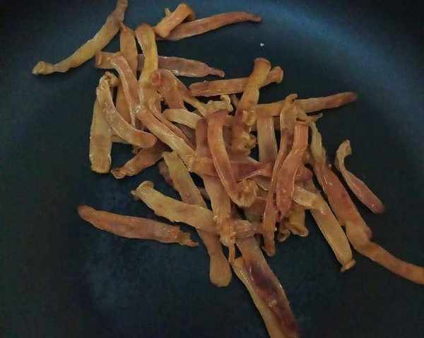 3.炒沙蟲幹,鍋洗幹凈,開火,燒熱後轉小火,放進沙蟲幹,炒到變焦黃色即可,剪成小段備用。