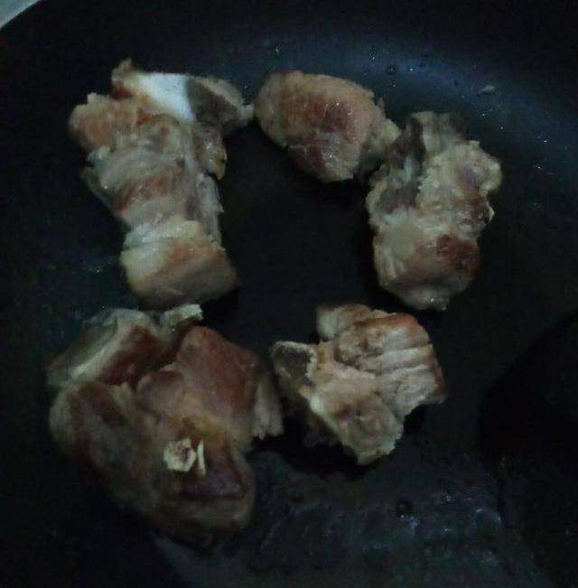 4.煎排骨。起鍋,加水,燒開,排骨焯水,然後再另起鍋,鍋熱,加油,煎排骨,煎到兩面焦黃色就可以,備用。