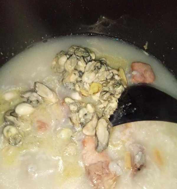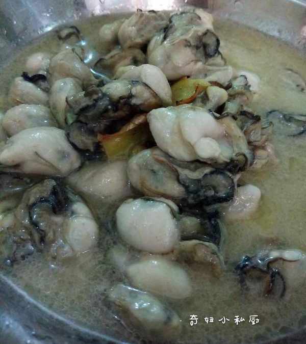 8.提示音響,氣體也排好瞭,開鍋,倒進海蠣,再熬8分鐘即可。
