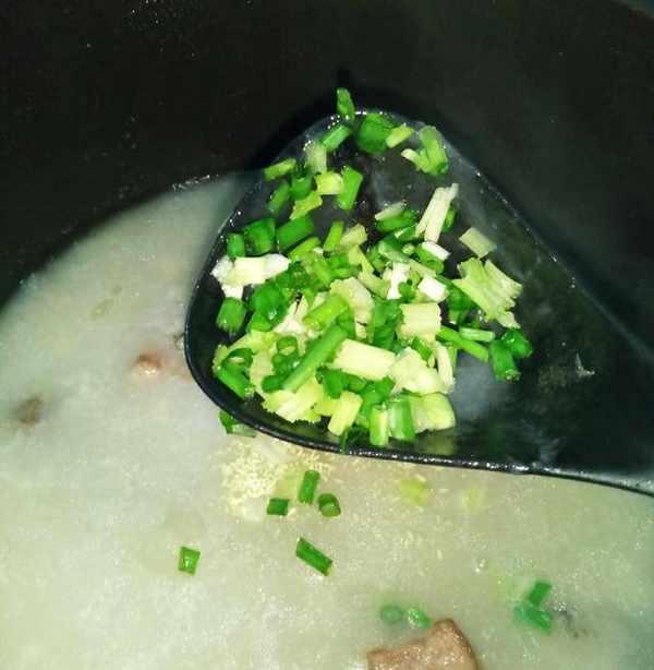 9.熬好,開鍋,加適量鹽,少量雞精,胡椒粉適量,蔥,芹菜末,至此,粥好瞭,開吃吧
