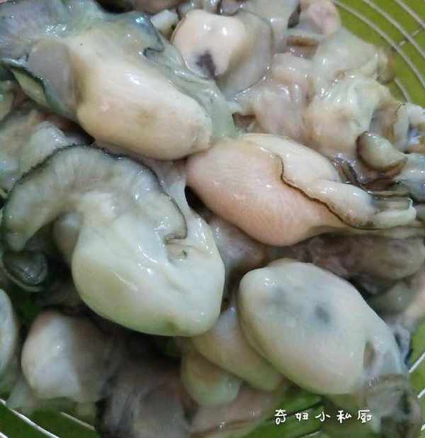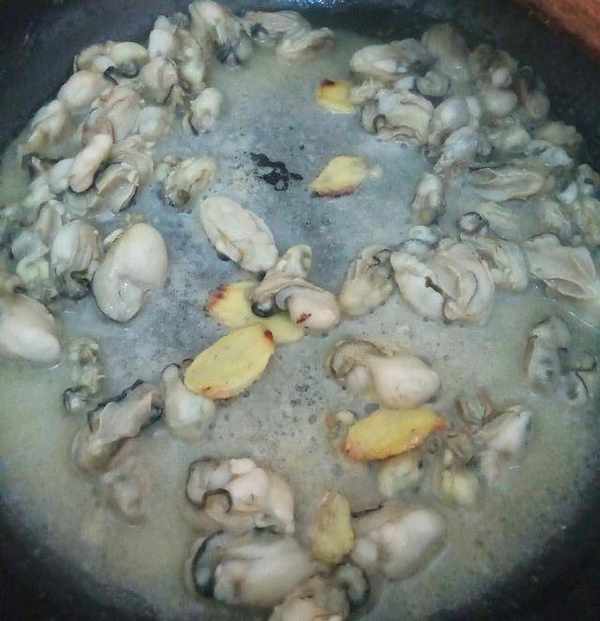 6.炒海蠣。起鍋,鍋熱,加油,爆薑片,大火,加海蠣,快速炒至變色即可,備用。