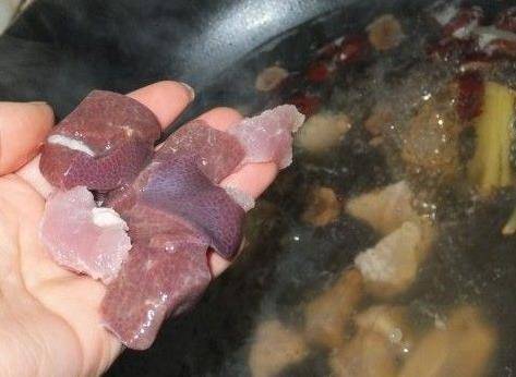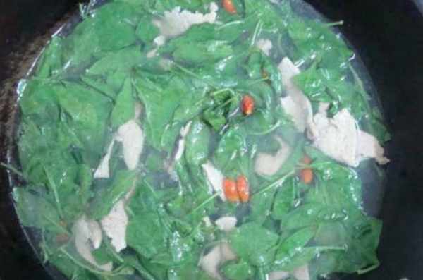 第四步、豬肉煮至斷生後,把枸杞葉、枸杞和豬肝放進鍋裡,用小火和豬肉一起煮,再撒一些食鹽、雞精進行調味。當枸杞葉被煮熟後,這道【枸杞豬肝湯】就做好瞭,清熱解暑、胃口大開。